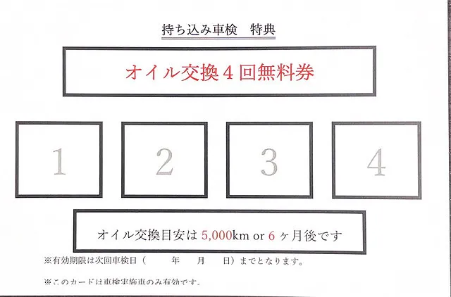 車検を持ち込みでご依頼いただいたお客様には、オイル交換が4回無料になるオイルカードをプレゼント!